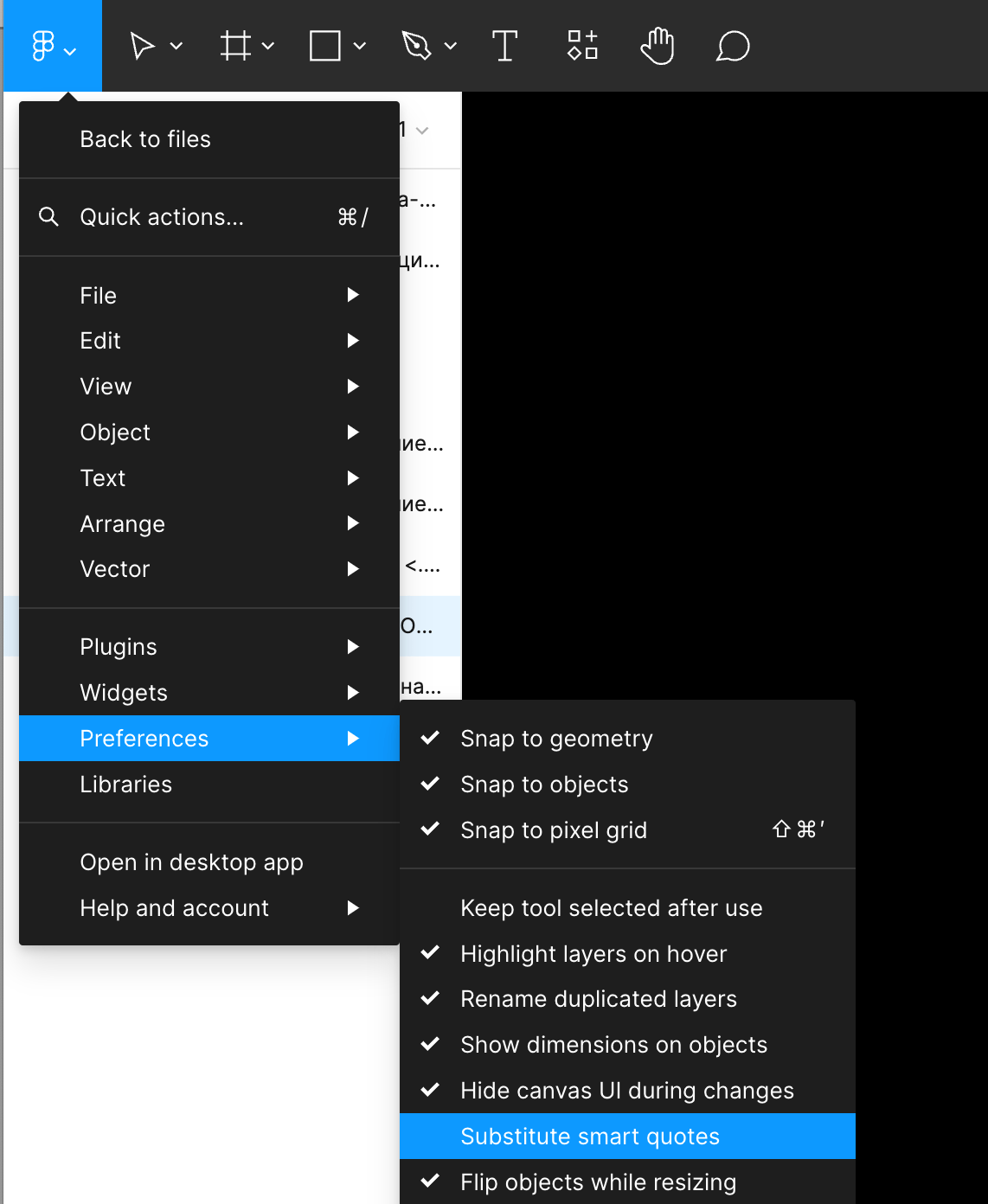 Но в Figma для корректной работы микротипографа с кавычками нужно в Preferences убрать галочку с пункта Substitute smart quotes. [Напоминаем, как включить в Figma работу со «своими» шрифтами, а не только предустановленными в программе: Help and account → Open font settings]